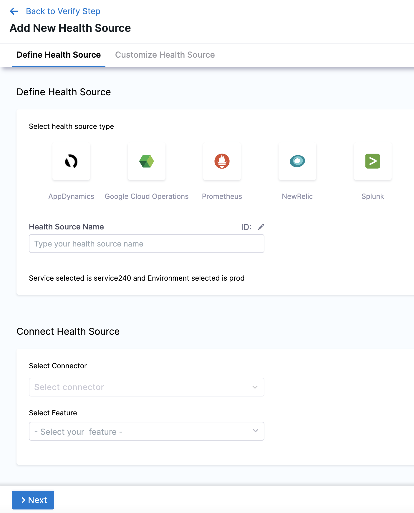 The subsequent settings in Customize Health Source depend on the Health Source Type you selected. You can customize the metrics to map the Harness Service to the monitored environment.
