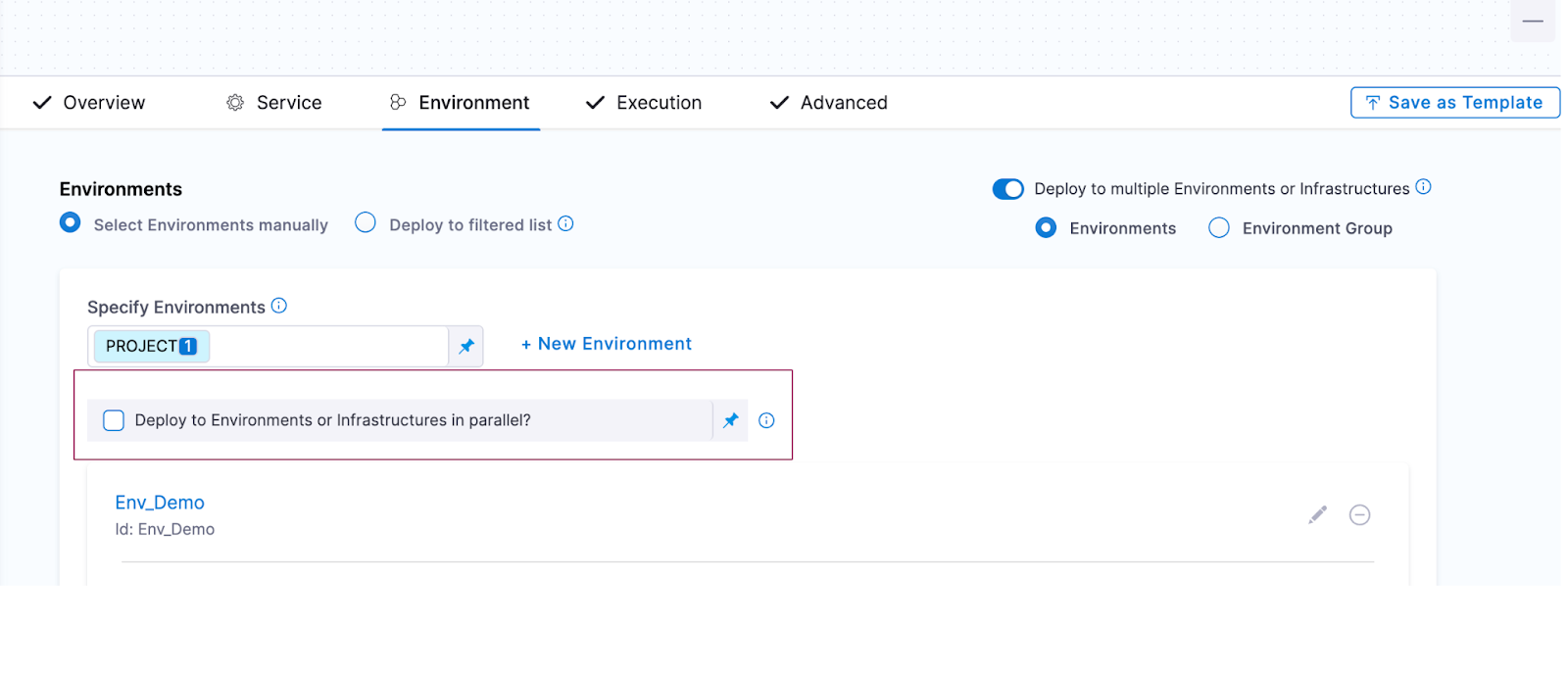 - If you select Deploy to Environments or Infrastructures in parallel, Max concurrency is equal to the number of environments or infrastructures.