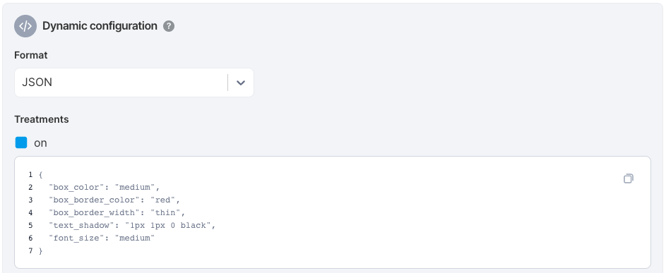 Select JSON as your format to get a JSON editor for each of your treatments as follows: