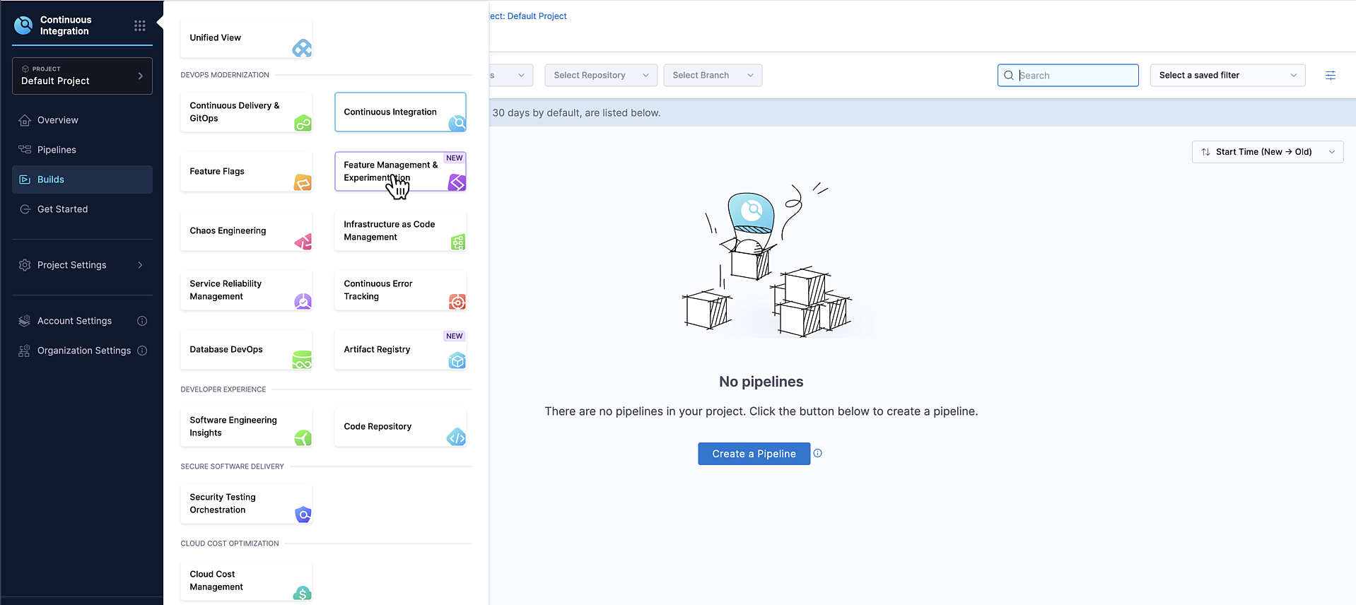 2. In the modal, select Feature Management & Experimentation (FME) under DevOps Modernization. You are redirected to the Harness FME module landing page.