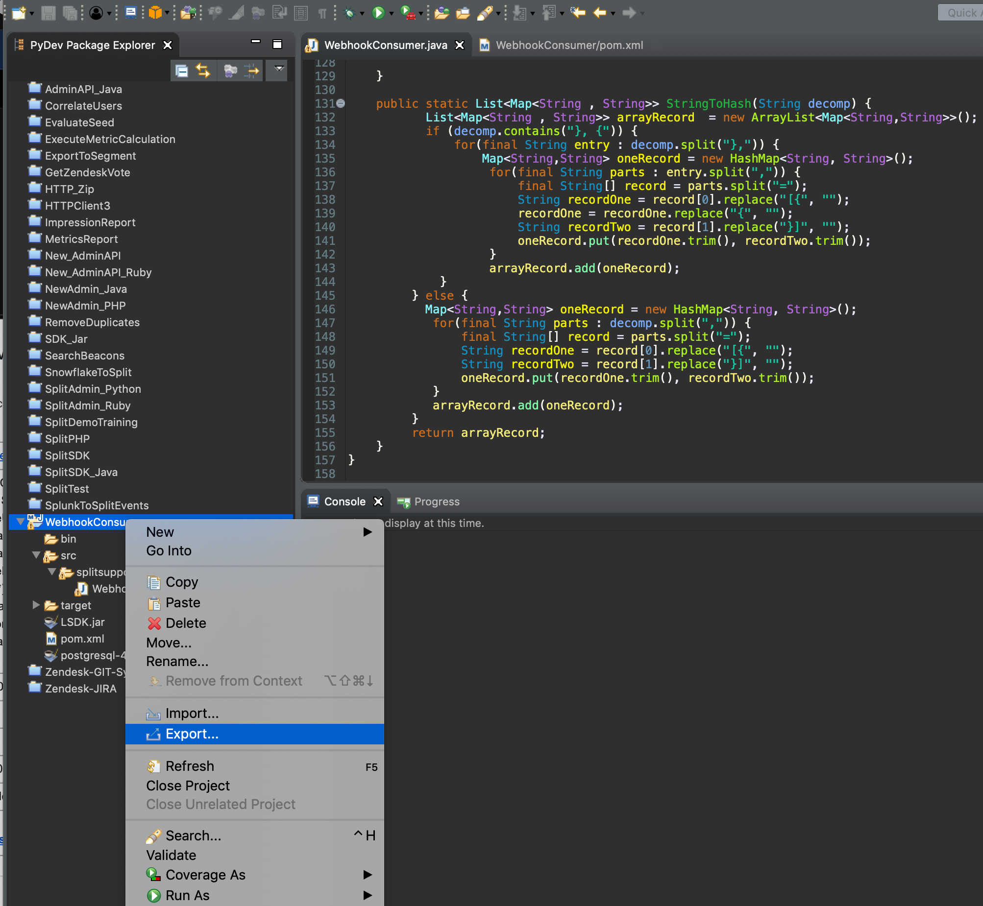 10. Insert the code below in the class (the class name here is WebhookConsumer.java), make sure to replace the awsAccessKey, awsSecretKey, kinesisStreamName, and awsRegion. The code below will convert the JSON structure passed from the POST request to Dictionary objects, then loop through each Impression block and send a bulk post to the Kinesis Stream service.