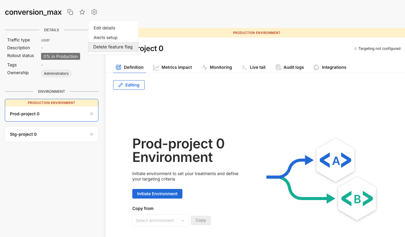 To delete a feature flag, delete all the definitions from its environments.