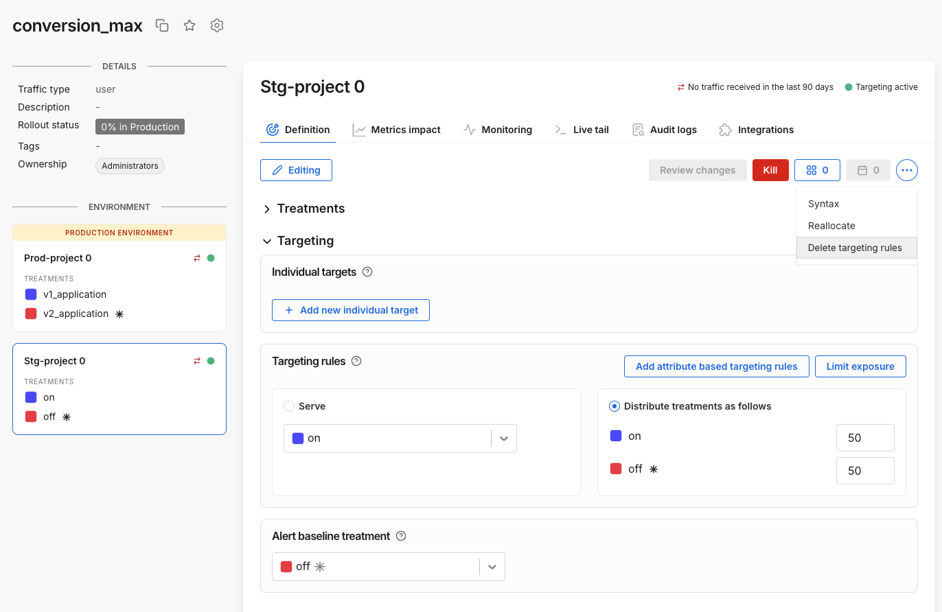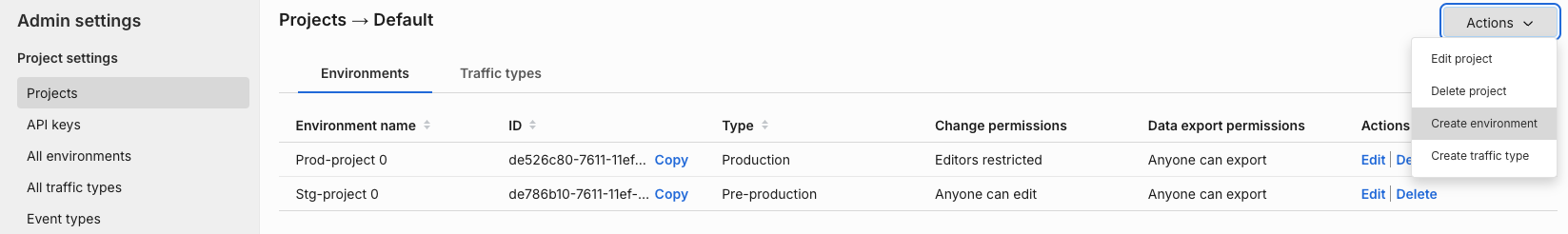 This project has two environments and one traffic type created underneath it. You can rename and edit these environments and traffic types and add more to the Default project. The following objects are also located in a project: