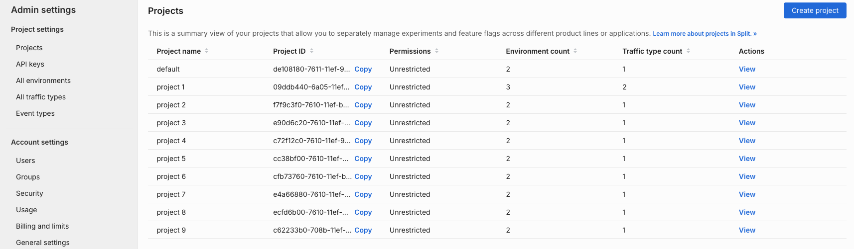 Each Split project has a project permissions setting which you can use to restrict access to that project to specific users, groups, or API keys. If a user, group, or API key is not granted access to a restricted project, they cannot see the project name nor determine whether that project exists.
