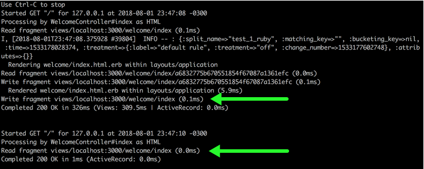 Rails has built-in support for fragment caching, which can be used to cache parts of views that do not vary between users. We updated the previous view to show a cached fragment along with a non-cached one that is recreated on each request.