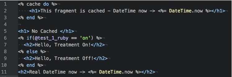 Rails has built-in support for fragment caching, which can be used to cache parts of views that do not vary between users. We updated the previous view to show a cached fragment along with a non-cached one that is recreated on each request.