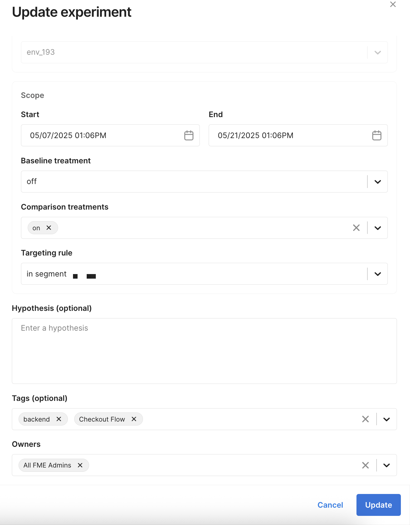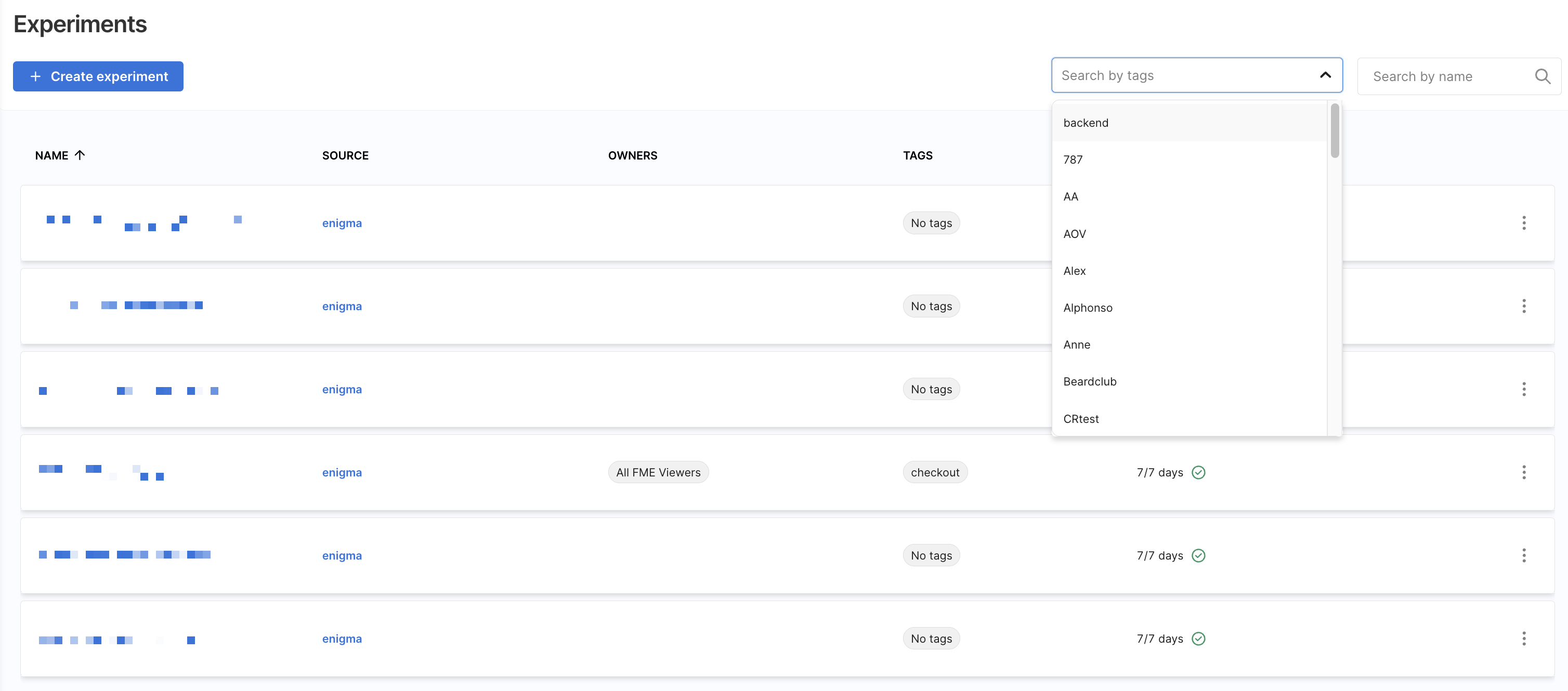 | By experiment purpose or scope | Group experiments related to onboarding, checkout flows, or other test initiatives. | onboarding, checkout, retention-test |