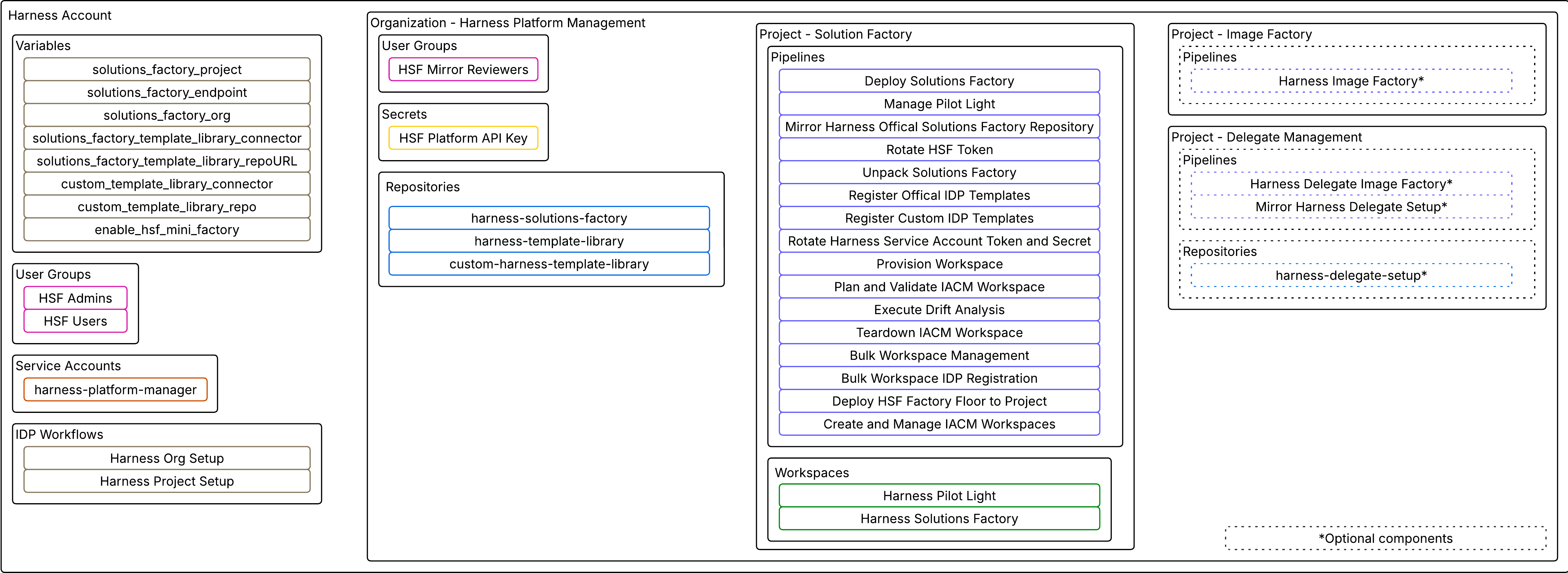 A service account named harness-platform-manager is created at the account level. This service account has admin privileges and is responsible for provisioning and managing the resources necessary for running HSF workflows.