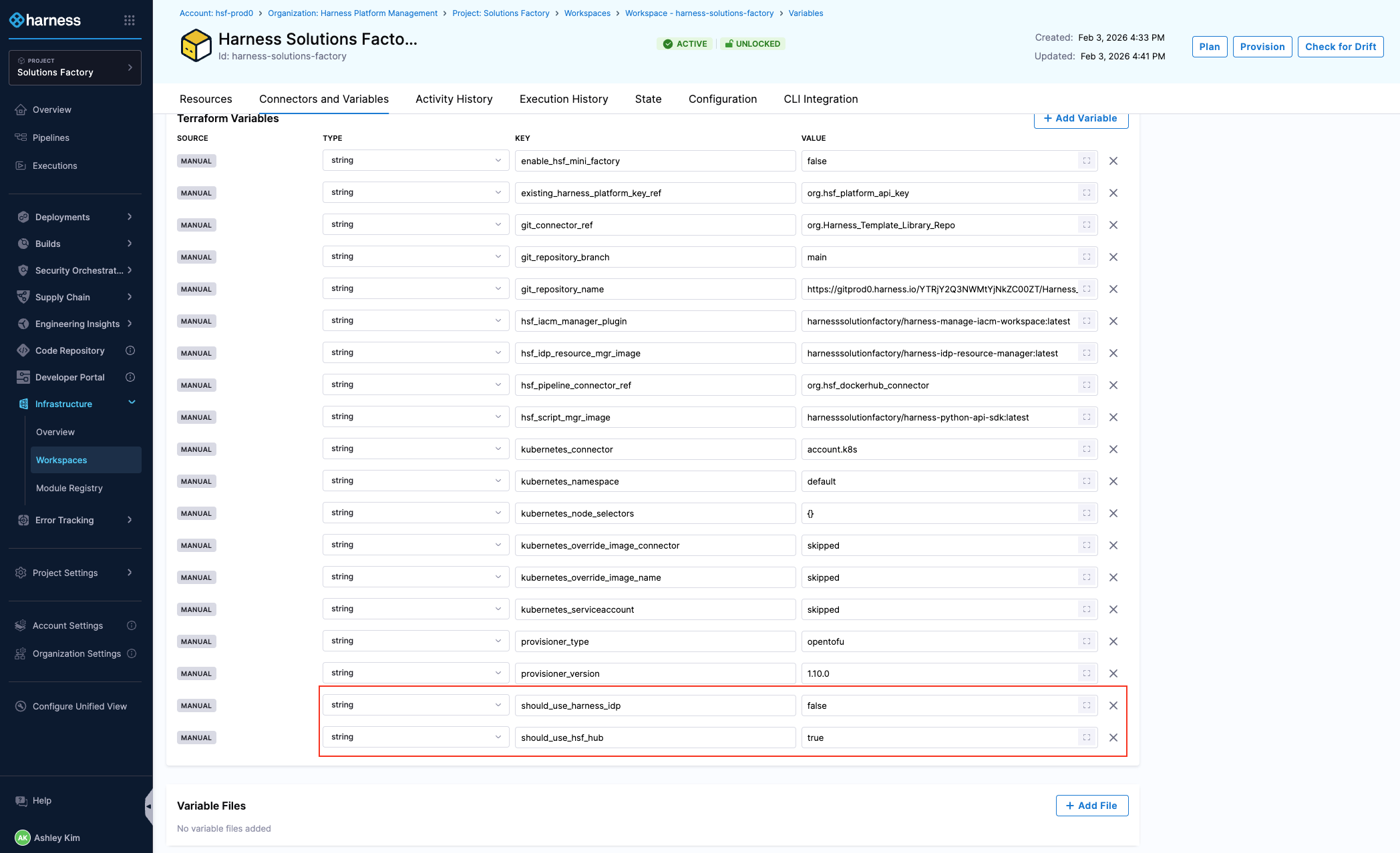 2. Go into the Connectors and Variables tab and scroll down to find the should_use_harness_idp and should_use_hsf_hub variable.