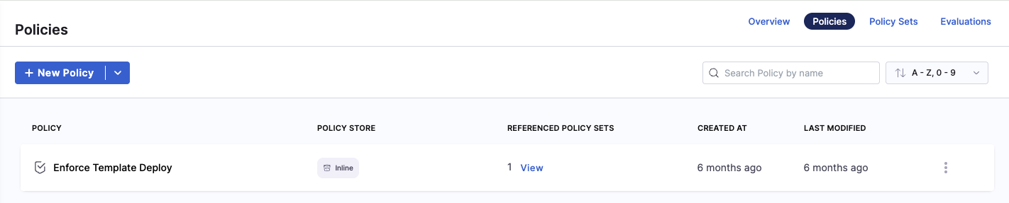Here you'll see a full list of policies, along with the policy store and the number of referenced policy sets for each one. Click the View button to open a modal showing the complete list of referenced policy sets.