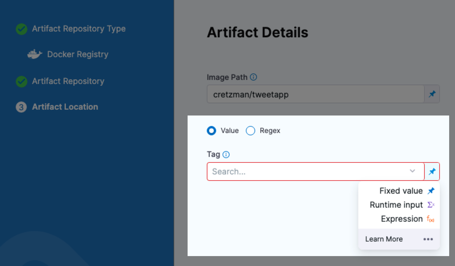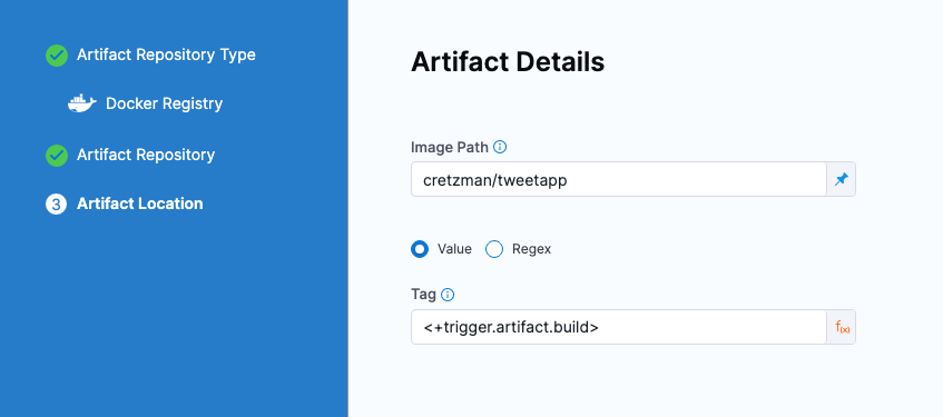If you use a Fixed Value for the artifact Tag (for example, 2), when the trigger executes the pipeline, Harness will deploy the artifact with that tag (2).