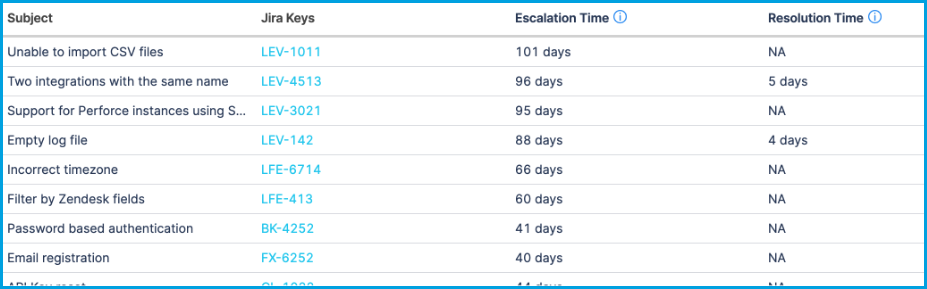 - Support Escalation Report: Understand how many engineering issues (ex. Jira issues) and code changes result from support tickets.