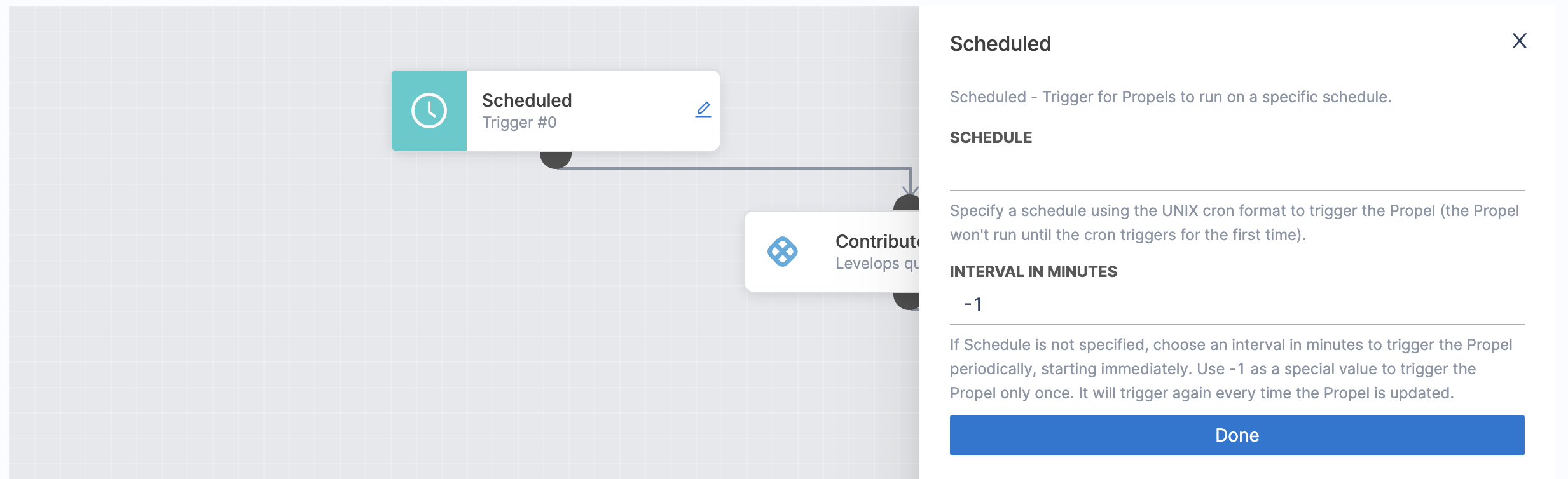- Define the schedule (cron format) or interval for the Propel to run periodically. This can be done using a scheduled trigger in the Propel configuration.